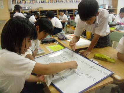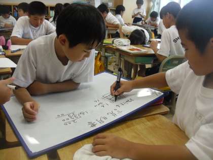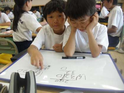 5年生は算数で小数の割り算を学習しています。今日は、(320÷1.6)という整数÷小数の割り算の解き方を考えました。