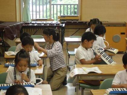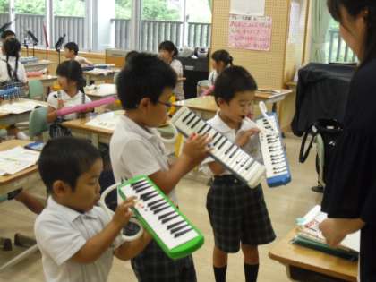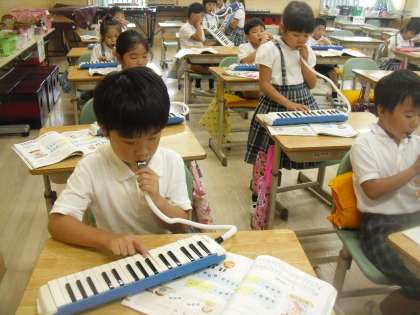 1年生は音楽で、鍵盤ハーモニカを使って「なかよし」を演奏しました。教科担任が指の動きを確認していました。
