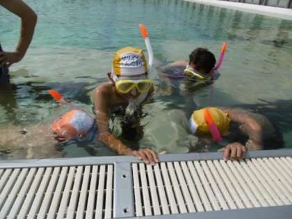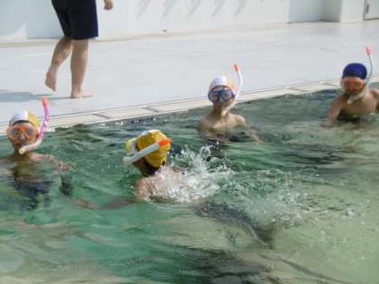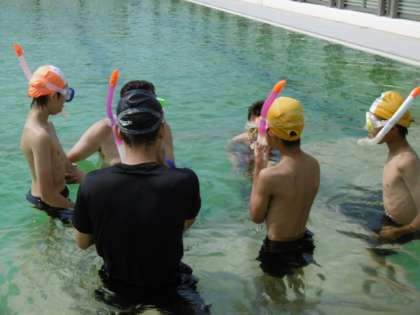 近隣にあるダイビング・サービス「シーマンズ」のスタッフの方々がゲストティーチャーとして来校し、シュノーケルを教えてくださいました。沖縄修学旅行できれいなサンゴを見ることができるよう、少しずつ練習していきます。
