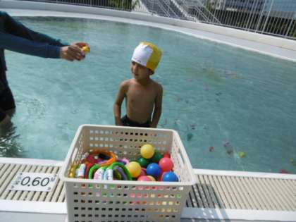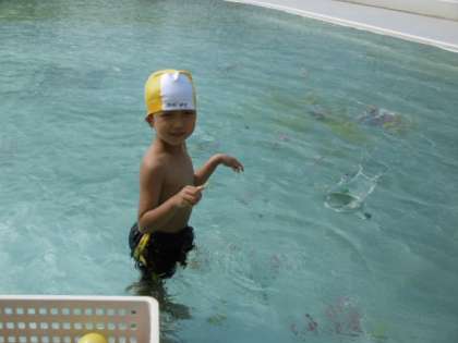 小プールで水遊びを楽しんでいます。おもちゃを水の中にたくさん投げ入れ、これから拾いに行くところです。