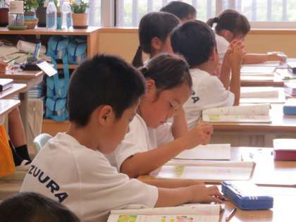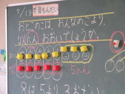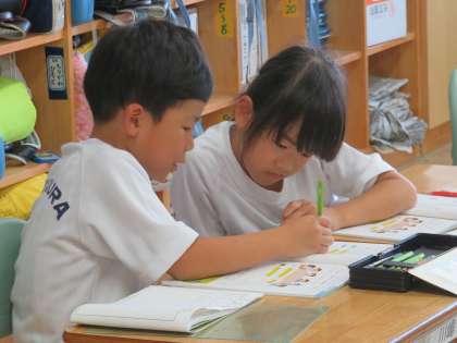 1A算数 数の学習 友達と確認しています。1年生暑い中ですが、集中して頑張っています。