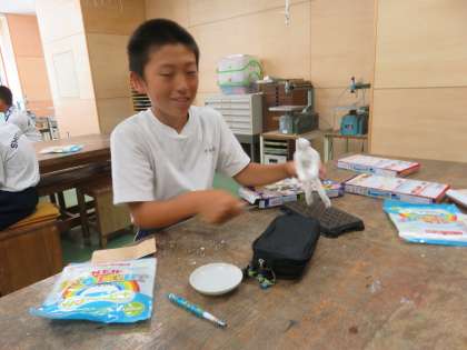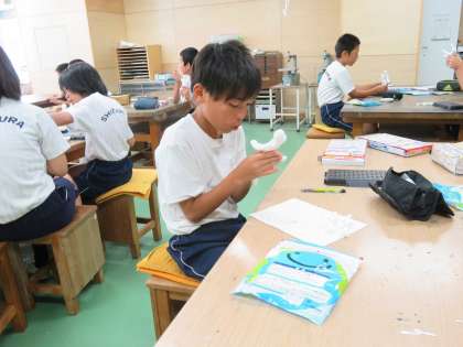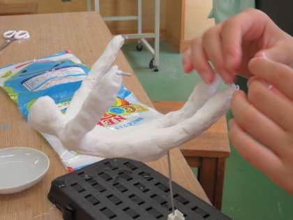 6A図工 12年後のぼく わたし 粘土で制作しています。足とか手をどのように付けるのか説明を聞いていました。