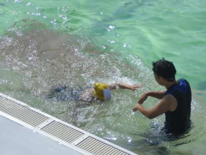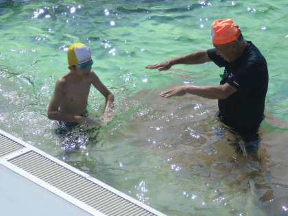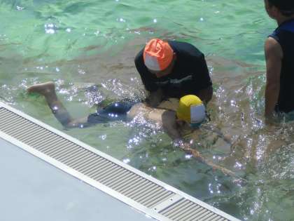 5年生は体育で水泳を行いました。教科担任と学級担任がプールに入り個人児童を行っていました。