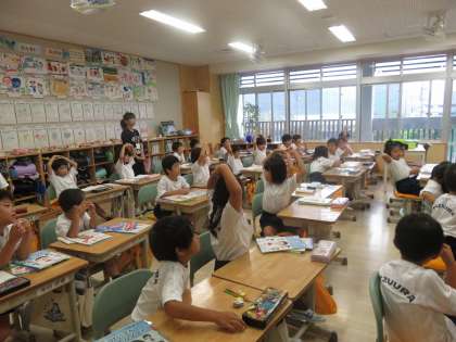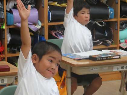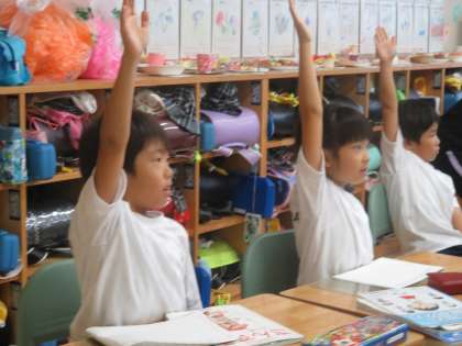 10より大きい数を勉強してます。小野先生からの質問に一生懸命答えています。学ぶ姿勢が素晴らしいです。友達が答えて正解だと手で○の合図です。