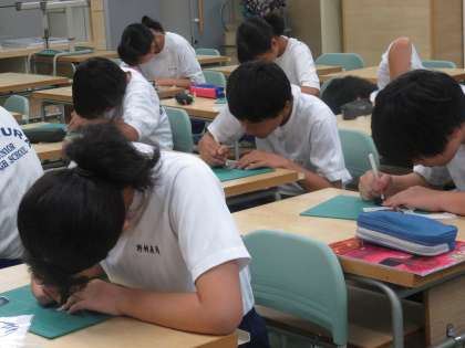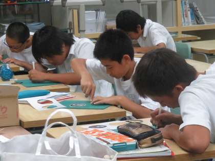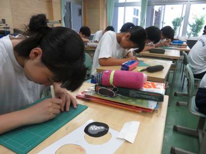 パネルを切り抜きしています。これから沖縄修学旅行に向けてデザイン作りです。