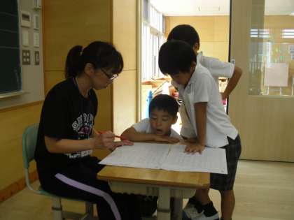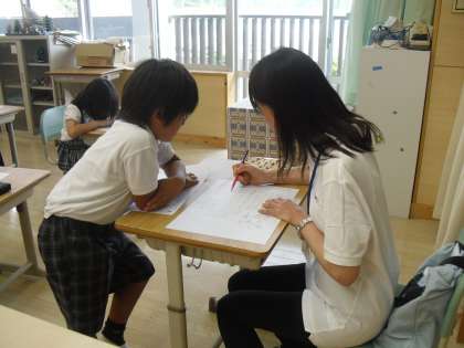 くろしお塾では、カタカナをきれいに書く練習をしていました。お手本を丁寧になぞり、とてもきれいな字で書いています。納得がいかないと、何度も消しゴムで消し、きれいな字に仕上げていました。
