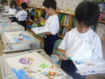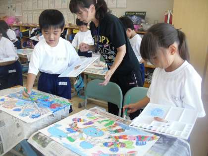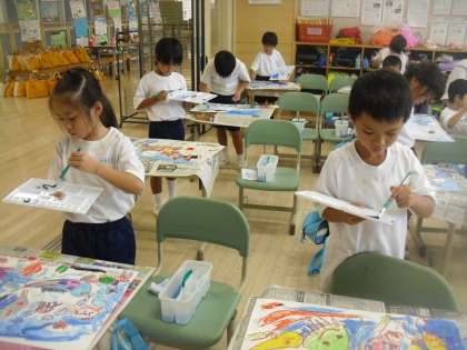 1年生は、図工で絵画にチャレンジしています。今日は、「絵の具を使って絵を仕上げよう」という学習課題のもと、はじめて絵の具を使い、色塗りをしました。