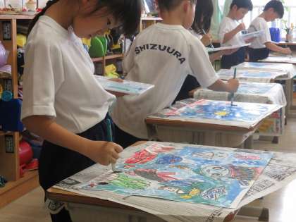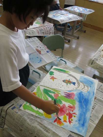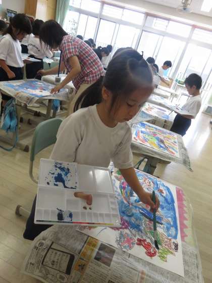 絵の具を使って絵を仕上げよう。水の量を調整することで、色の塗り方を学習しています。みんな上手ですね。展示の部でぜひ子供たちの力作をご覧ください。