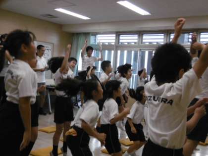 授業の始めのウォーミングアップでは、英語の歌を体を動かしながら楽しく歌っています。今日は初志部の先生方も一緒に参加してくださっています。