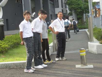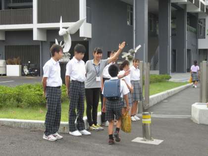 この時期の子どもたちの活動は、早朝より始まります。自治会執行部のやまびこ挨拶運動です。