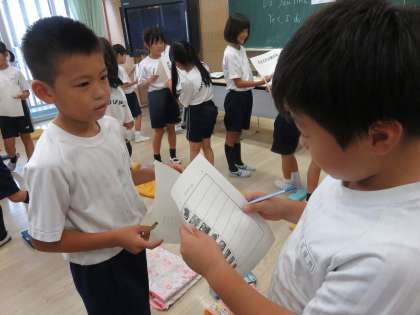 子どもたちが、友達や先生方にも好きな食べ物を聞いています。