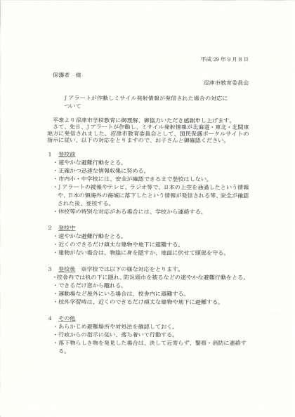 Jアラートが作動した場合の対応について先日、配布させていただいた文書通りの対応をお願いいたします。