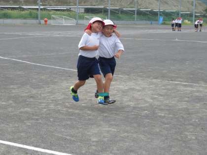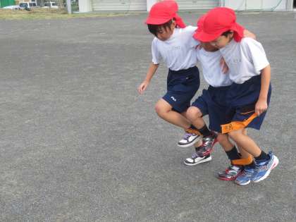 2年生はトラックを使って3人4脚の練習です。