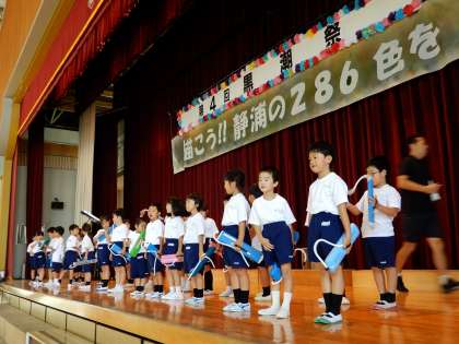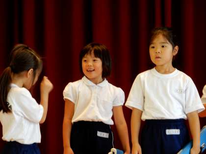 「おんがくとなかよし」です。4月より大きく成長した姿を楽しみにしてください。笑顔で頑張ります。