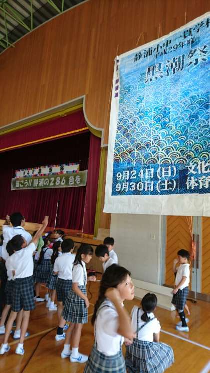 みんなで作成した全校作品「集結!静浦魂」を休み時間に見ています。