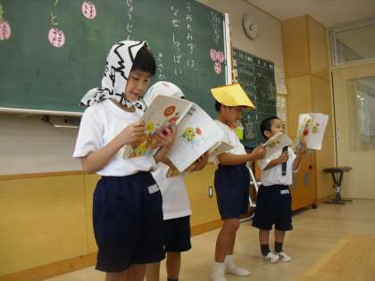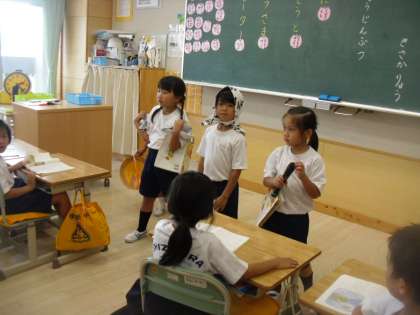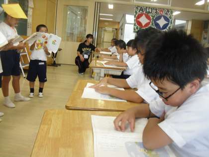 1年生は国語で「うみのみずは なぜしょっぱい」を学習しています。今日は4人1チームとなって朗読会を行いました。みんななかなか上手でした。