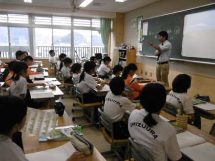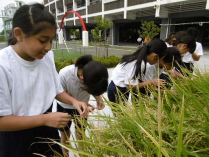 学習問題は「稲作に必要なものは何だろう」です。5年生が学校で育てた米が上手に育ったため、どうしてうまくいったのか話し合っています。この後、皆で育てた米を見に行き、学習を深めていました。