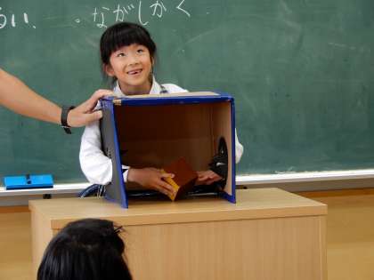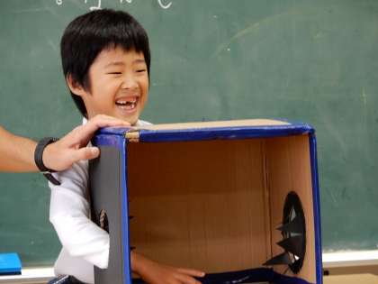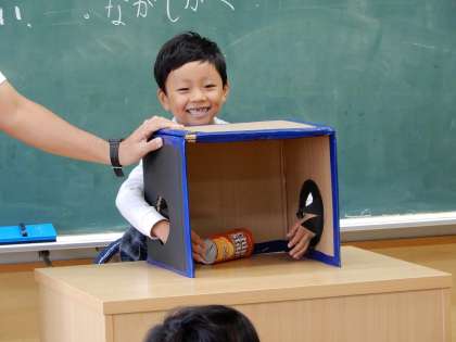 ブラックボックスに入った模型や箱を実際に触って感想を伝えています。