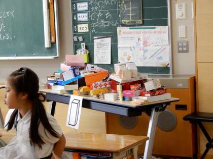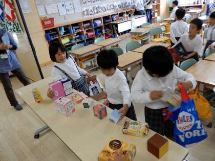 子どもたちは、家庭から持ってきた様々な箱を二人一組で分類しています。次の時間に確認をします。いろいろな箱があり、分類が難しい箱もあります。立体図形の特徴や性質をしっかりつかむことが大切です。