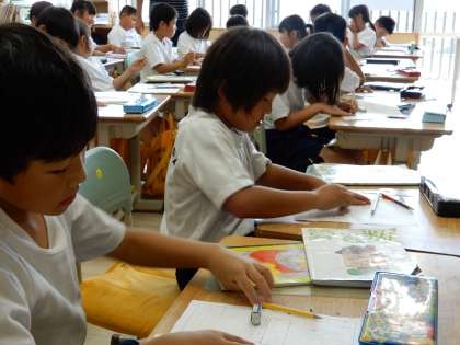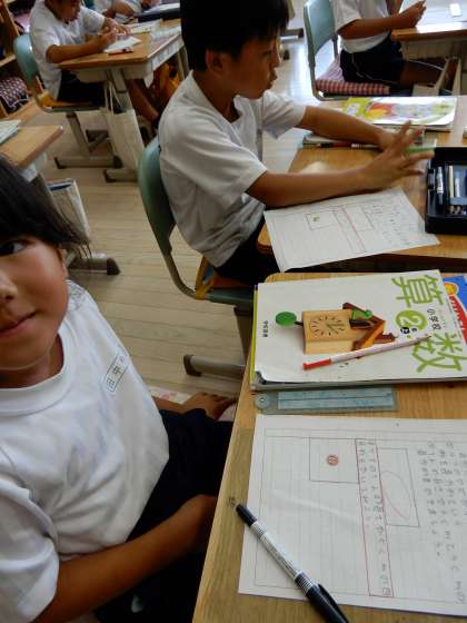 2年生は算数で「四角形」について学習しています。今日は、全ての辺が5cmの四角形を書く活動をしていました。