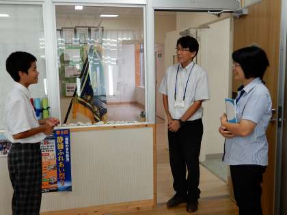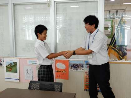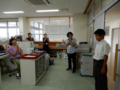 英語の自己紹介を暗唱してスピーチ(校長室と事務室)をしてくれました。大変すばらしい発音と内容で感動しました。ありがとうございます。