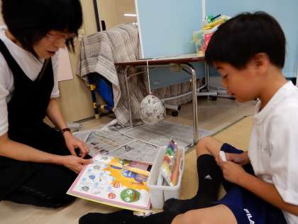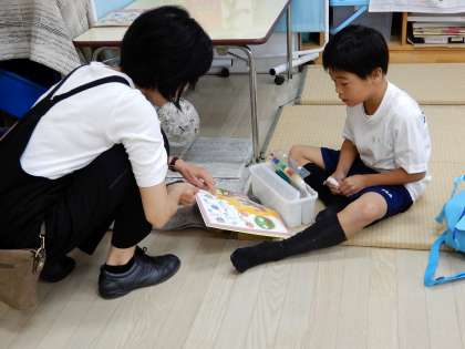 朝の会と図工でお面制作の様子です。本日は白色を塗ります。完成が楽しみですね。