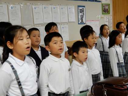 4年生は元気よく合唱をしていました。住友先生が水槽の掃除をしてくれていました。
