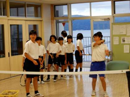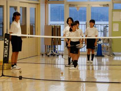 ○女子ソフトテニス部です。4階コモンスペースで室内練習場のように練習しています。7年生が下級生に優しく教えています。