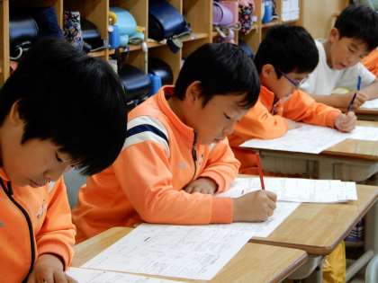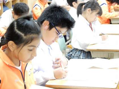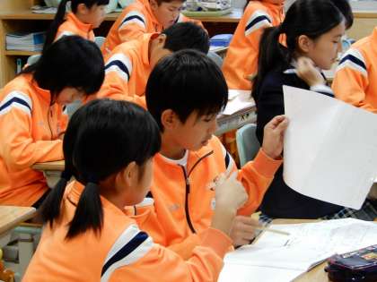 5Aも中間テスト返しです。算数の問題しっかり確認しておきましょう。友達に質問しています。