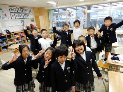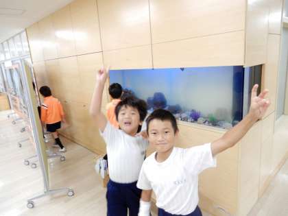 水槽の周りにも子どもたちが魚を見ています。体育館では7時半より連合音楽会に向けて合唱練習を頑張っています。