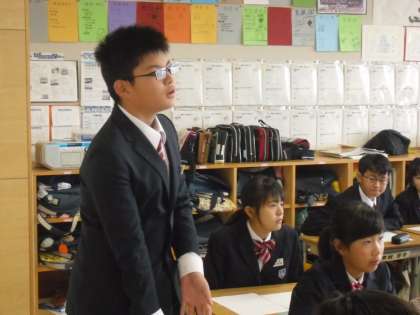 「ぼくのきもち」という資料をもとに、生命尊重についてみんなで熱く議論しました。がんと診断された父親に主人公の「僕」は告知すべきか、しないべきか。全員がネームプレートで意思表示し、意見交換しています。