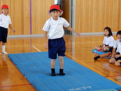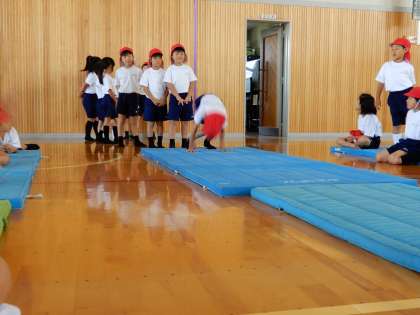 マット運動で前回りの練習です。みんな頑張っています。