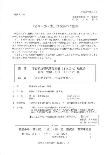 保護者の皆様も、お時間がありましたら是非参加いただければと思います。3日に保護者の皆様へ案内を出しましたが、その用紙の下に参加申込書がついておりますので、そちらにご記入の上、23日(月)までに担任にご提出ください。