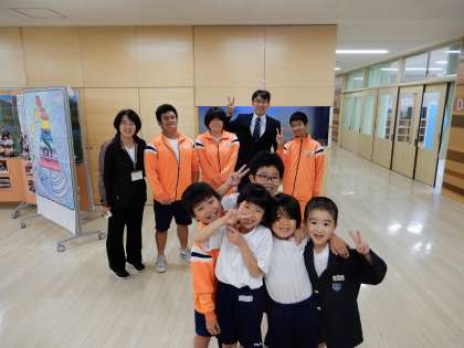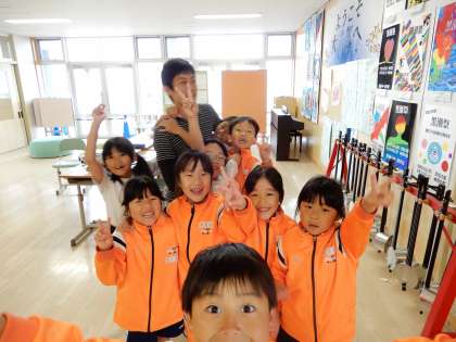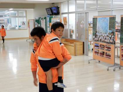 2年生の子どもたちは、隆宏先生と4階へ探検に来ていました。大志部の生徒が、初志部フロアーで子どもたちと楽しく交流しています。本校ならではの時間です。