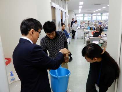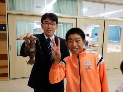 伊勢海老のひげまできれいに脱皮しています。先生方も興味津々です。水槽の中では食物連鎖が起きています。伊勢海老はよく食べます。