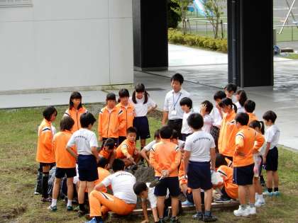 「流れる水の働きについて」実際に砂場で大きな山を作って水の流れを確認します。
