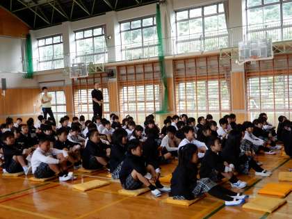 本日は志部集会です。初志部集会は体育館で行っています。志部委員から後期の活動などの紹介がありました。