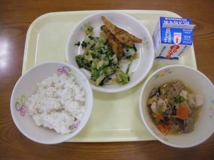 今日の給食の献立 米飯 牛乳 肉豆腐 わかさぎのごまフライ おひたし