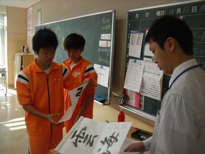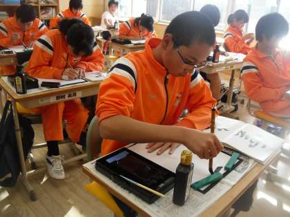 8年生は書写の時間において毛筆「雲海」を行っていました。みんな集中して視写していました。