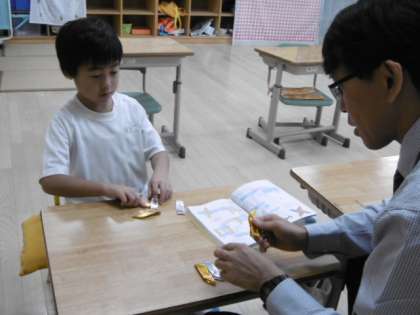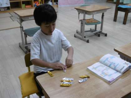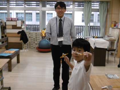 図工では折り紙を使って手裏剣を折っています。金と銀のすてきな手裏剣が完成しました。とても上手に折ることができていました。