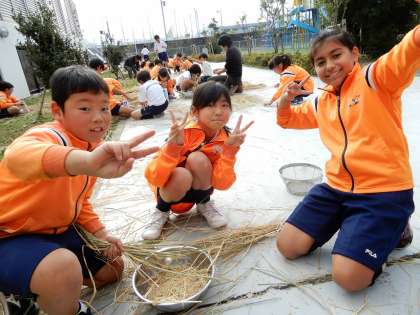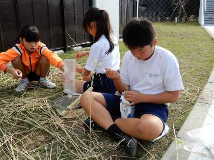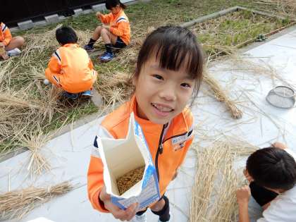 先月、静浦米を収穫して、乾かしました。今日は脱穀です。牛乳パックを使ったり、割り箸を使ったりして工夫して子どもたちが脱穀をしています。子どもたちは「なかなかたいへんです」と、自分たちの口に入るまでに様々な過程があることを理解できました。お米一粒一粒に感謝の心です。
