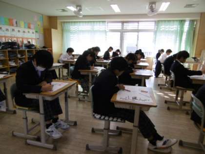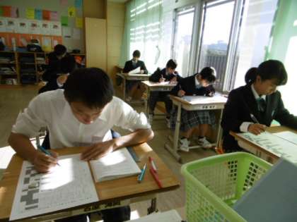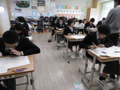1時間目のテストは社会科です。物音ひとつ立てずに考えています。努力したことは必ず報われます。よい結果となりますように…。