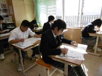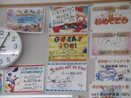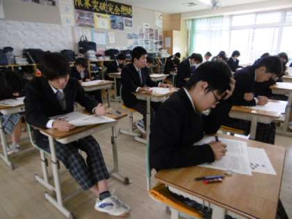 1時間目は社会科の期末テストです。担当の教員が見回った後、「よく勉強しているなって思いました。」という感想を言っていました。さすが、9年生です。前方の壁には、提出物をクラス全員が出せたことをお祝いする掲示物がたくさん貼ってありました。