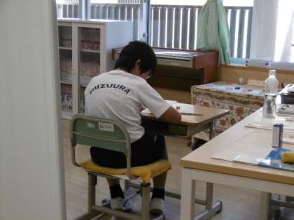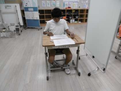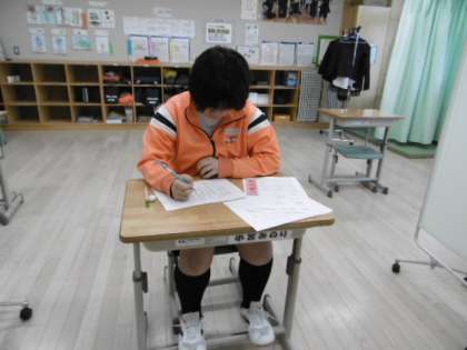 国語の期末テストを受けています。落ち着いて考えている様子です。明日のテストも頑張ってください。