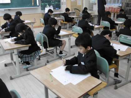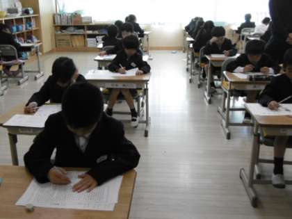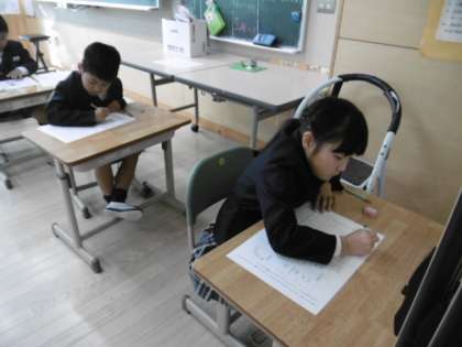 1時間目は国語の期末テストを受けています。2年生は全員出席です。