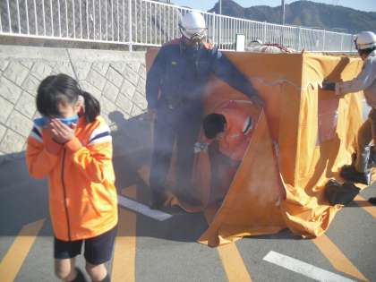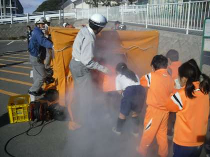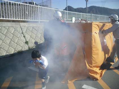 教室に戻る際、煙を充満させた場所を通過するスモーク体験を行っています。