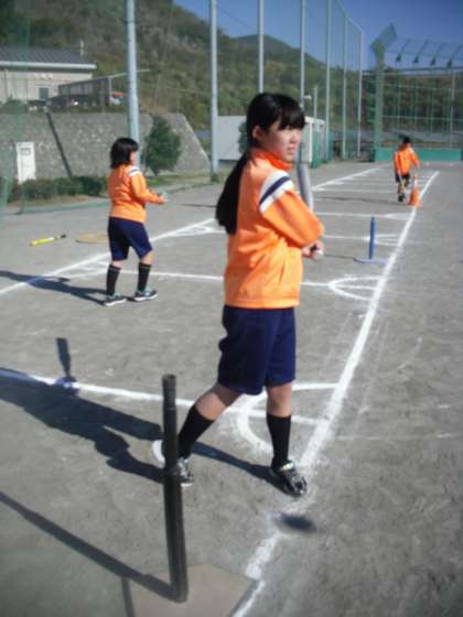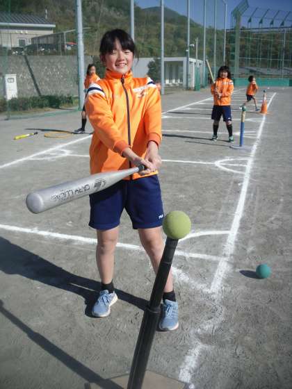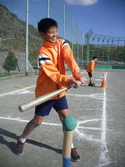 6年生は体育でソフトボールを行っていました。技術の向上をめざし、一人ずつバッティング練習を行いました。