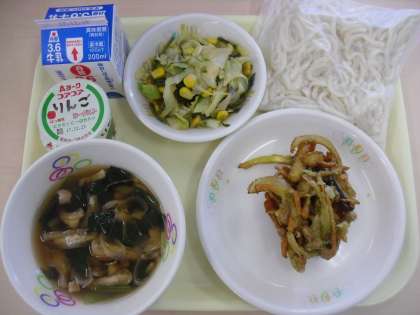 今日の給食の献立 かきあげうどん 牛乳 茎わかめサラダ りんごヨーグルト