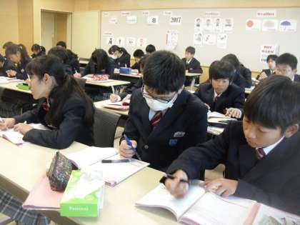 7年生は英語で現在進行形について学習しています。最初に現在進行形について慣れ親しんだ後に、英語ノートに文法事項をまとめました。