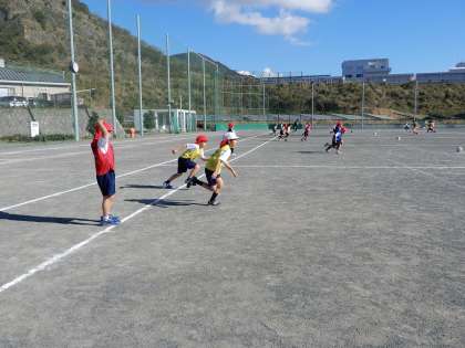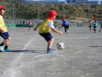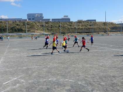 ミニコートでミニサッカーです。江本先生がルールを決めて楽しくゲームをしています。